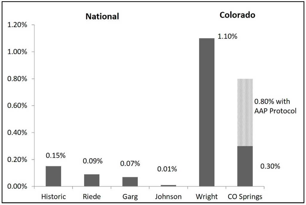Pulse oximetry data obtained in this subset of newborns was analyzed in order to determine the overall failure rate using the modified algorithm. The data was also retrospectively analyzed to calculate the first screen failure rate had the AAP protocol been used in the same newborn cohort. These results were compared to each other and to historical failure rates both at altitude and sea level.