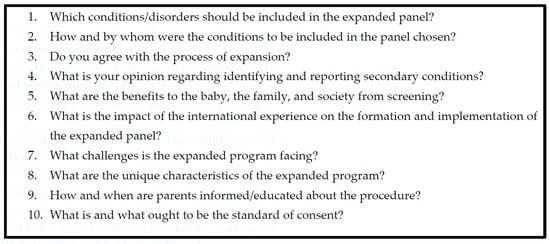 In the interview (which covered a broad range of topics) the respondents were asked about their background, ethical, legal, and cultural concerns in the decision-making process about the expansion of the panel and reporting of results. Among other questions, interviewees were asked to discuss the current education provided to prospective parents or parents of newborns, as well as the informed consent process in the expanded NBS program. In addition, they were asked if they think the existing process should be modified. Selected questions from the interview guide are presented in Figure 2.