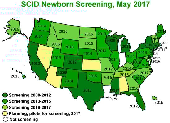 The assay of T cell receptor excision circles (TRECs) in newborn dried blood spot specimens has revolutionized the ability to detect severe combined immunodeficiency (SCID) in its pre-symptomatic phase and has therefore led to significant improvement in outcomes for SCID-affected children. Implementation of population-wide SCID newborn screening (NBS) was piloted in 2008 in Wisconsin and has been rapidly adopted, with 49 states and Puerto Rico now either routinely screening all newborns or planning to do so in 2017 (Figure 1) []. TREC NBS for SCID permits identification of infants with SCID and a number of other T lymphopenic disorders before development of infections and other complications. It has also paved the way for future population screening, including the use of genome and exome sequencing.