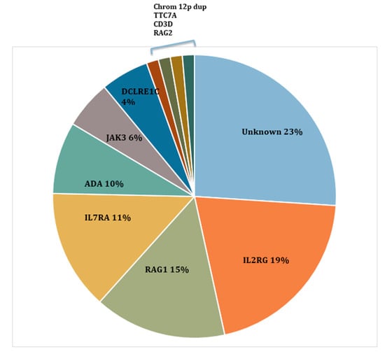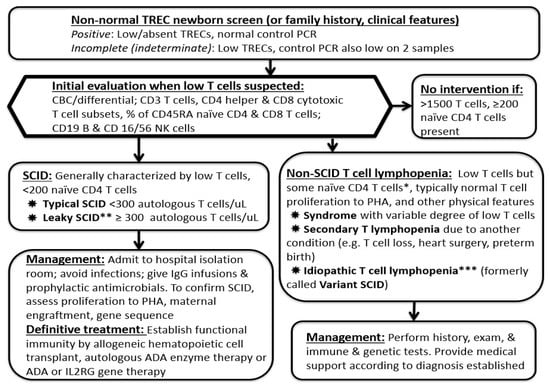NBS with TRECs has allowed us to identify newborns within weeks of birth, before infection and other complications have set in. SCID is now primarily based on laboratory diagnosis []. Patients with typical SCID have fewer than 300 autologous T cells/µL, less than 10% of the lower range of normal proliferation to the mitogen phytohemagglutinin (PHA), and/or detectable transplacental maternal T cell engraftment (TME), as well as deleterious mutations in recognized SCID genes in most cases (Figure 2). Patients with leaky SCID have 300–1500 T cells/µL or more but lack naïve T cells. Their T cells are functionally impaired and have limited diversity, and TME is not detected. A subset of infants with leaky SCID have expansion of oligoclonal dysregulated T cells, leading to adenopathy, erythroderma with cutaneous and intestinal T-cell infiltration, hepatomegaly, eosinophilia, and highly increased IgE levels, features collectively known as Omenn syndrome (OS) [].