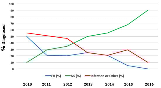 In 2014, 11 NBS programs had screened over 3,030,083 newborns with a TREC test []. Screening detected 52 cases of typical SCID, leaky SCID, and Omenn syndrome affecting 1 in 58,000 infants. Two years of SCID NBS data from California identified birth prevalence rates of non-SCID TCL at approximately 1/20,000 [,].
