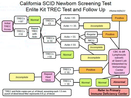 - Kwan, A.; Church, J.A.; Cowan, M.J.; Agarwal, R.; Kapoor, N.; Kohn, D.B.; Lewis, D.B.; McGhee, S.A.; Moore, T.B.; Stiehm, E.R.; et al. Newborn screening for severe combined immunodeficiency and t-cell lymphopenia in California: results of the first 2 years. J. Allergy Clin. Immunol. 2013, 132, 140–150. [Google Scholar] [CrossRef] [PubMed]