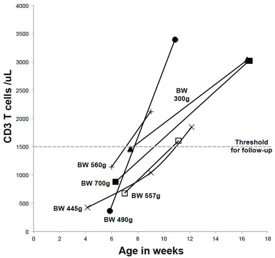 Preterm low birthweight infants with low TRECs and T lymphopenia. Birth weights (BW) are indicated. Subsequent T-cell concentrations were greater than 1500 cells/µL (dotted line); the threshold was set by using the California Newborn Screening Program. Figure adapted from Kwan, A. et al., 2013 [].