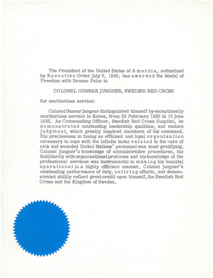 Announcement 6 July 1945, that Colonel Gunnar Jungner, Swedish Red Cross, has been awarded the Medal of Freedom with Bronze Palm by the President of the United States of America for meritorious service.