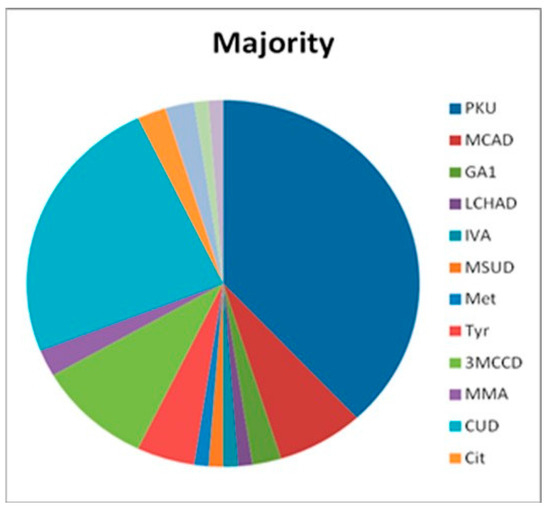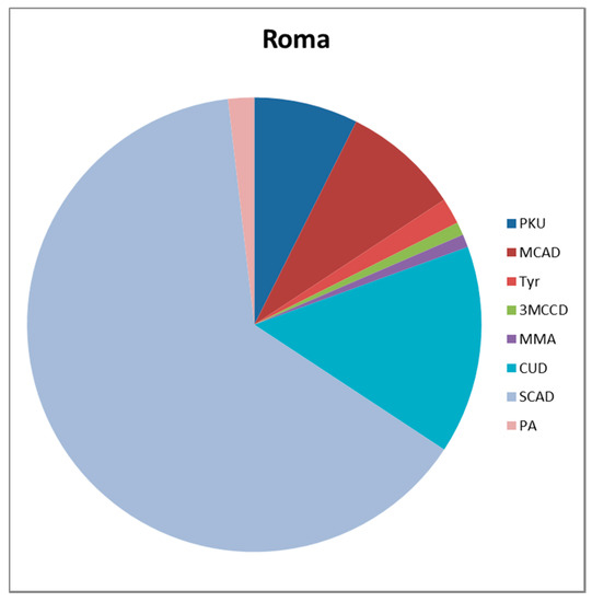 When the group is identified by ethnicity, the distribution of IEM is even more obvious. PKU is the most common disorder in the majority (M) ethnic group, followed by CUD and there is a wide range of IEMs (Figure 1). The most common disorder in the R ethnic group is SCAD, followed by CUD, MCAD, and PKU in fourth place (Figure 2). In this ethnic group, the spectrum of IEMs is not as diverse as in M ethnic group.
