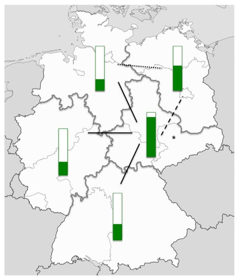 Pulse oximetry screening in Germany in December 2009. Green bars indicate the percentage of perinatal and neonatal units performing pulse oximetry screening as per December 2009 in five regions in Germany. The black lines indicate the level of significance (dotted line: p < 0.05, dashed line: p < 0.01, solid line, p < 0.001). The asterisk indicates the federal state of Saxony. Source of the map: adaptation from svg/2000px-Germany_location_map.svg.png; author: NordNordWest; http://creativecommons.org/licenses/by-sa/3.0/de/legalcode.