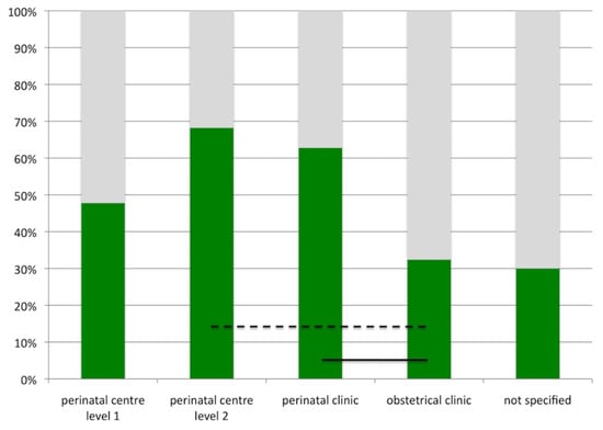 Pulse oximetry screening and level of neonatal care. Green bars indicate percentage of units using pulse oximetry screening as per December 2009 in Germany. Black lines indicate level of significance (dashed line: p < 0.01, solid line, p < 0.001).