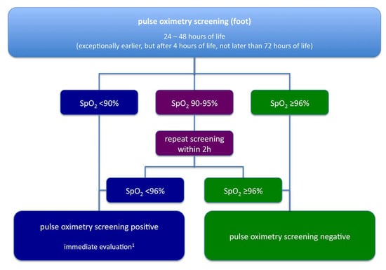 - Tautz, J.; Merkel, C.; Loersch, F.; Egen, O.; Hägele, F.; Thon, H.M.; Schaible, T. Implication of pulse oxymetry screening for detection of congenital heart defects. Klin. Padiatr. 2010, 222, 291–295. [Google Scholar] [CrossRef] [PubMed]