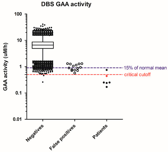 Distribution of screening acid α-glucosidase (GAA) activity in negatives, false positives, and patients. Whiskers: 1–99th percentile; box: 25–75th percentile; line in box: median; diamond in patients: IOPD; solid dots in patients: suspect LOPD.