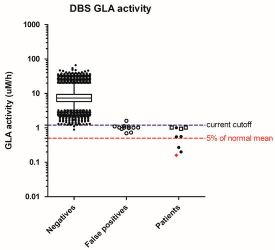 Distribution of screening acid α-galactosidase (GLA) activity in negatives, false positives, and patients. Whiskers: 1–99th percentile; box: 25–75th percentile; line in box: median; Diamond in patients: classic mutation; solid dots in patients: suspect type 1 mutation or confirm type 2 mutations; hollow squares in patients: c.636 + 919G>A mutation.