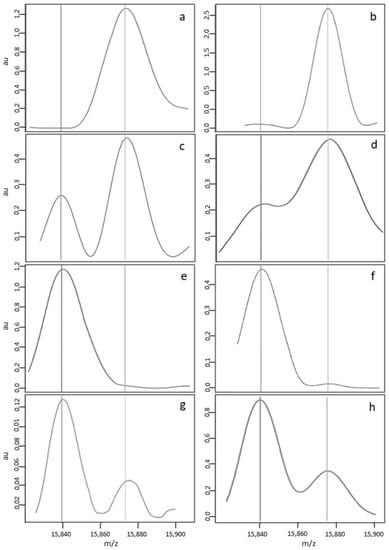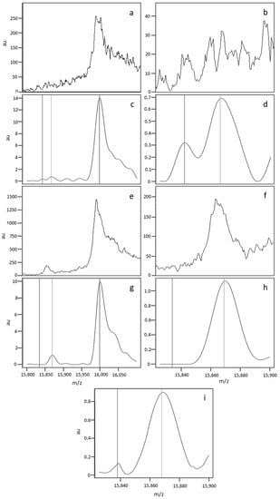 The spectra in (a,b,e,f) correspond to the raw data generated for the first (a,b) and third (e,f) of the quadruplicate depositions from the same sample. (a,c,e,g) show the whole spectrum (15,800–16,100 Da), and (b–f,h,i) show the region of interest (15,820–15,900 Da). The spectra in (c–h correspond to the processed spectra after alignment, baseline subtraction, and normalisation. The median spectrum (i) was obtained by compiling the individual normalized spectra.