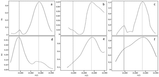 A nonstandard median MS profile was detected in 14.7% of the analyses in Dijon and 7.6% of the analyses in Lille. The MS profiles were considered to be nonstandard (Figure 3) for one of three reasons. Firstly (cause 1, see Table 3), some profiles had a nonregular baseline or a slightly distorted peak; this applied to (i) FA MS profiles with a variably broad/sharp/distorted peak but very low intensity at 15,837 m/z ± 5 Da, relative to the βA peak (Figure 3a,b); an FAS MS profile with minor deformation of the βS peak (Figure 3c); and FS and S-β+-thalassemia MS profiles with an irregular baseline (data not shown) and a deformation of the βA peak (Figure 3d). Secondly (cause 2), some profiles had a low, broad peak at 15,837 m/z; this applied to (i) FA MS profiles with a variably shifted peak or (ii) FAS MS profiles characterized by a broad, well-centred peak at 15,837 ± 5 m/z but that was much less intense than the βA chain peak at 15,867 m/z (data not shown). Thirdly (cause 3), some FA MS profiles had a broader βA peak that variably overlapped with the region of interest at 15,837 m/z and led to misclassification as “FAS” (Figure 3e), whereas other FAS MS profiles showed a low resolution and thus poor separation of the βA and βS peaks, giving a single large peak as a shoulder and no plateau between the peaks (Figure 3f).