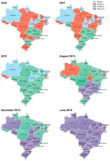Figure 1 illustrates the sequential expansion of the neonatal screening program in the various states of Brazil between 2010 and 2014.