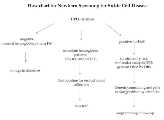 The purpose of this manuscript is to highlight some of the technical challenges that we had to face in the development of our pilot screening. The objectives of this study were: (i) to define the sensitivity of our methods in order to establish a cut-off percentage for normality in the presence of low levels of β-globin chains, (ii) to maintain high-quality results to ensure the accurate interpretation of the analysis for immediate initiation of supportive care for affected newborns, (iii) to check the stability of the sample over time to ensure reliable measurements, a very important issue in a multicenter setting, (iv) to verify the organization and feasibility of a multiregional screening program. Finally, the flow chart for newborn screening for SCD is shown in Figure 1.