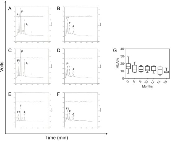 Representative chromatograms of a dried blood spot analyzed within 7 days from blood withdrawal (A,C,E) and after four (B), eight (D) and sixteen months (F). Percentages of HbA analyzed after different months from the blood withdrawal (G). At least five samples for group were analyzed.