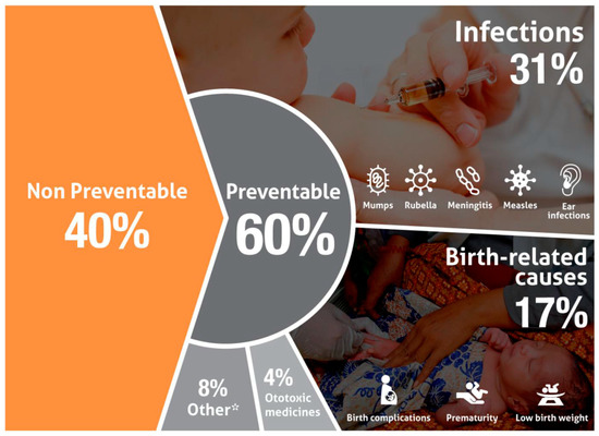 Causes of preventable hearing loss. Other causes include congenital non-genetic malformations and other maternal prenatal causes (from: [18]).