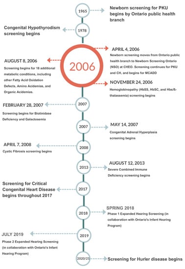 NSO performs blood spot based screening for metabolic and endocrine disorders as well as for hemoglobinpathies, cystic fibrosis (CF) and severe combined immune deficiencies (SCID). Multiple tier testing strategies are also used for a number of these diseases. In addition, NSO offers diagnostic and monitoring testing for many of the aforementioned disorders. Further, NSO coordinates and administers the provincial critical congenital heart disease (CCHD) point of care screening program []. NSO is also working with the Ontario’s Infant Hearing Program (IHP) to phase in blood spot testing for hearing loss risk factors including cytomegalovirus (CMV) DNA and certain key genetic risk factors []. Figure 1 shows a timeline of newborn screening in Ontario from the beginning of province wide screening for Phenylketonuria (PKU) forward.
