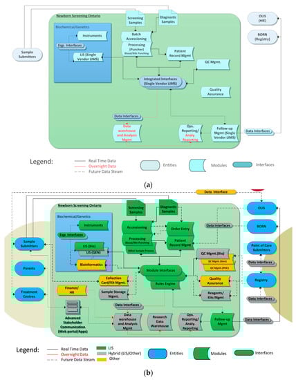 (a) NSO Enterprise Architecture—Initial State; (b) NSO (Newborn Screening Ontario) Enterprise Architecture—Desired Final State.