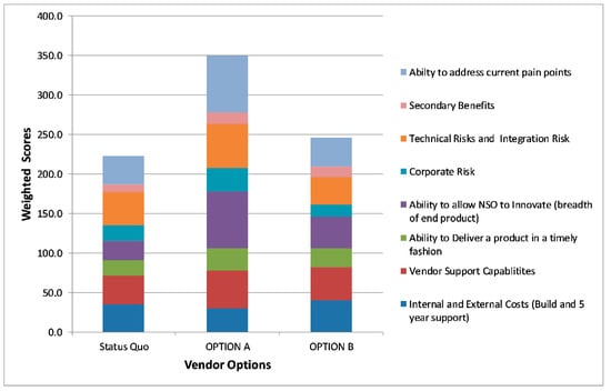 Eight key factors were identified as critical to the overall decision, including: The internal and external costs including personnel and consultants, software and hardware costs and project costs associated with the build for this option (higher score means lower costs); vendor support capabilities; the ability to deliver a product in a timely fashion; the ability to allow NSO to innovate; technical integration risks including the technical underpinnings of the software and how easy or hard it will be to integrate with other systems (higher score means lower risk); secondary benefits which includes the vendor fixing our current issues without creating new ones. Figure 5 shows an anonymized mock-up of the decision matrix tool that was used to make the final vendor choice.