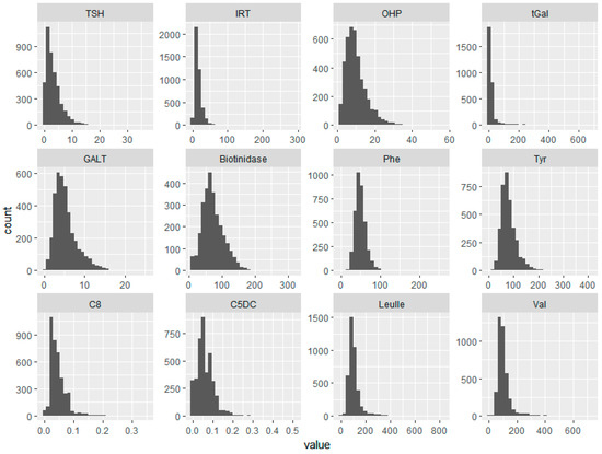 The distribution curves of all analytes from 4360 sample values. TSH—thyroid stimulating hormone, IRT—immunoreactive trypsinogen, OHP—17-α-hydroxy progesterone, tGal—total galactose, GALT—galactose-1-phosphate uridyl transferase, Phe—phenylalanine, Tyr—tyrosine, C8—octanoylcarnitine, C5DC—glutarylcarnitine, Leu/Ile—leucine/isoleucine, Val—valine. Units of measurement are as in Table 1.