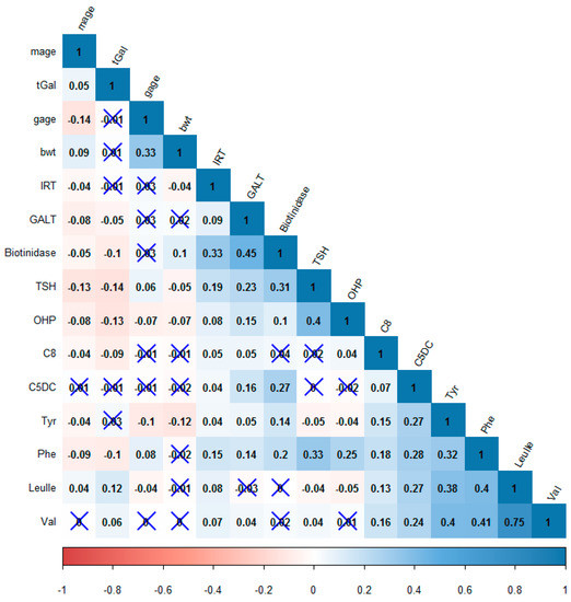 A Pearson’s correlation matrix heat map of the parameters measured in the study. Red—negative correlation, Blue—positive correlation. Correlations with insignificant p-values are marked with an “X”. mage = Mother’s age, gage = gestation age, and bwt = birth weight.