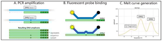 Summary of assay steps. (A) The exon 7 regions of SMN1 and SMN2 are amplified with a single set of primers, with one primer in excess. (B) A fluorescently-labelled probe binds to the amplicons. (C) The resulting melt curve indicates the SMN1 and SMN2 sequence presence and DNA quantity.