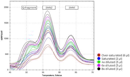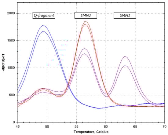 Patient identification—melting curve (MC) results. The purple lines represent normal samples, as determined by the presence of an SMN1 peak. The red lines show an absence of an SMN1 peak, identifying a spinal muscular atrophy (SMA) patient. The blue lines represent no DNA control reactions, which results in a high quantity (Q)-fragment. The profiles were acquired on the CFX96 Touch PCR-platform.