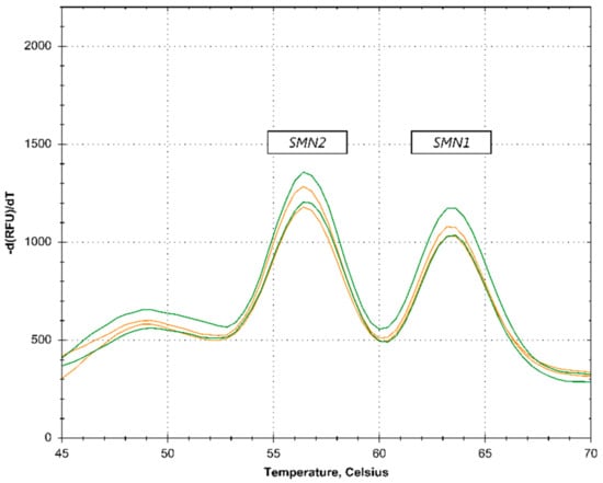 The melt curve profiles of a total of 422 anonymized and randomized samples were analyzed. Samples were considered SMA-positive when the SMN1 peak pattern was absent in the presence of an SMN2 pattern (Figure 2).