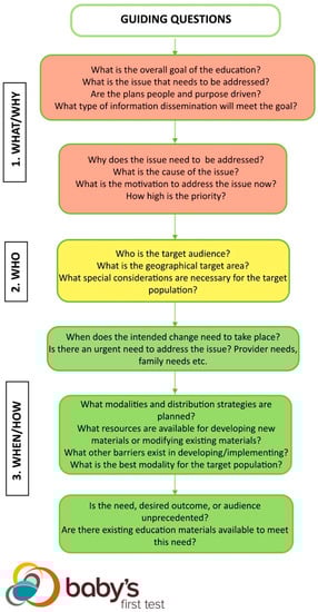 Moving downwards, the yellow “2. Who” level of the framework looks at the characteristics of the target audience for the education. An accurate understanding of the target audience is critical for intentional design and patient-centricity [8,9,11]. Audiences such as parents and families require different considerations for content and design compared to healthcare providers and vice versa. Public-facing materials need different messages, appearances, and mediums than materials intended for NBS program or hospital staff. Materials designed for the public are obligated to weigh factors such as geographic location, cultural factors such as preferences or sensitivities, translation, compliance with any legislature specific to the audience, literacy level, demographics, and access to the internet and other technologies. Some education is designed for use by a wider range of audiences, so these are modifiable for different situations. Other education interventions deal with specialized subject matter or are in specific formats that cannot be transferred to other contexts [5,11]. Charting each of these factors helps ensure the education approach is tailored to the needs of the community.