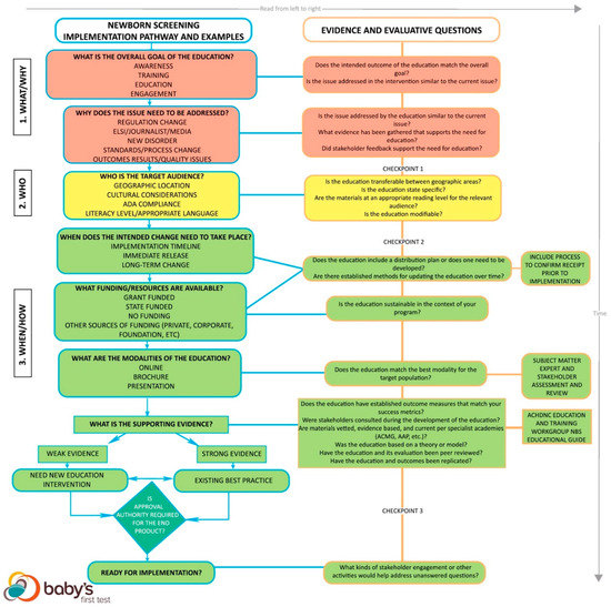After the modality, funding, and timeline are determined, the use of an existing best practice is compared with a new program. The quality of the supporting evidence for a best practice is weighed alongside the context of the situation [5,8,12,13]. If the need, desired outcome, or audience is unprecedented in some way, then a new approach is most appropriate. If there is not strong evidence to support an education approach as a best practice, then either a new program or an appropriate best practice are acceptable. If there is strong evidence to support an approach that has passed through all the previous criteria, then that approach is an appropriate best practice. Supporting evidence should be found in academic literature, specialist academies, and evaluations of other education programs. The NBS content needed for different situations is laid out in the Educational Planning Guide created by the Education and Training Workgroup of the Advisory Committee on Heritable Disorders in Newborns and Children [14].