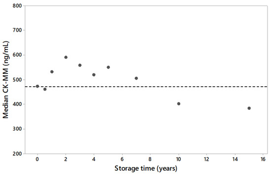 Figure 1. The stability of CK-MM in dried blood spot (DBS) specimens stored in a freezer (−20 °C) for a long period of time (years) presented as population median by storage time. A total of 120 sample results per time-point. Dotted line represents the median value of first timepoint.
