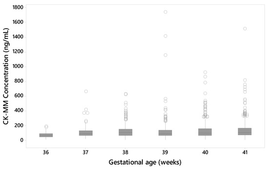 The data from the unaffected samples of Danish populations was used to evaluate the effect of the gestational age of the newborn to the CK-MM concentration levels. The median CK-MM concentration was increased with the gestational age of the newborn in unaffected specimens (Figure 5).