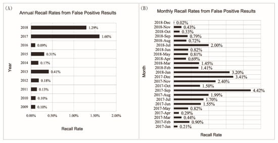 Recall rates of neonatal hyperphenylalaninemia (HPA) screening resulting from false positive results in Tianjin, China. (A) Annual recall rates due to false positive cases, numbers calculated by dividing total number of infants screened each year with number of infants recalled to the laboratory whose confirmatory tests were negative. (B) Monthly recall rate for 2017 and 2018 calculated in the same way, showing the gradual decrease of recall rate after the contaminated collection devices were replaced with new collection devices starting in January of 2018.