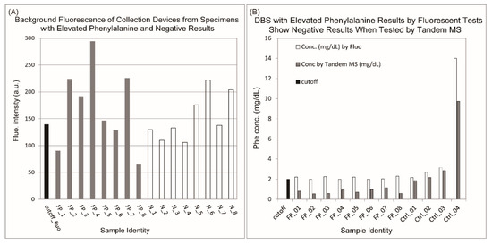 Increased false positive cases due to contamination of specimen collection devices by chemicals other than phenylalanine. (A) Fluorescent intensities above the cutoff value were observed for white filter paper discs from randomly selected samples with either false positive (FP) or negative results (N) from the same hospital. (B) Samples with false positive results in fluorescent tests showed negative results when tested by the tandem MS method.