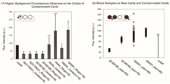 The difference between new collection devices and contaminated collection devices were identified by fluorescent tests. (A) White filter paper discs were punched from unused collection devices either on the ink circle or within the circle for background tests; and locations of discs on the collections devices are shown by round black dots either on the ink ring or inside the ring on the inset diagram. Contaminated collection devices showed higher fluorescence background than new collection devices, and fluorescence intensities of paper discs from the ink circle (ring) are significantly higher than that of discs from the center area (center) without ink. Two-tailed unpaired t-tests were conducted for the differential analyses. (#, p > 0.7; **, p = 0.010; *, p < 0.001). Error bars were 99.5% confidential intervals around the mean value of fluorescence intensities. (B) Single pieces of new card (Lot20180180, right section of the card with one ink circle) were attached to contaminated collection devices (Lot160001, left part of the card with three ink circles) and used for blood sampling as shown by the inset diagram. Punch locations were shown as round black dots. Blood discs (bs) and white filter discs (wd) from both old (* and × are data lables for bs and wd samples, respectively) and new collection devices (▲ and ■ are data lables for bs and wd samples) were tested. In the 20180180 bs data set (n = 79), in one of 80 cases, the attached new card was not used by the individual collecting the blood sample in the hospital.