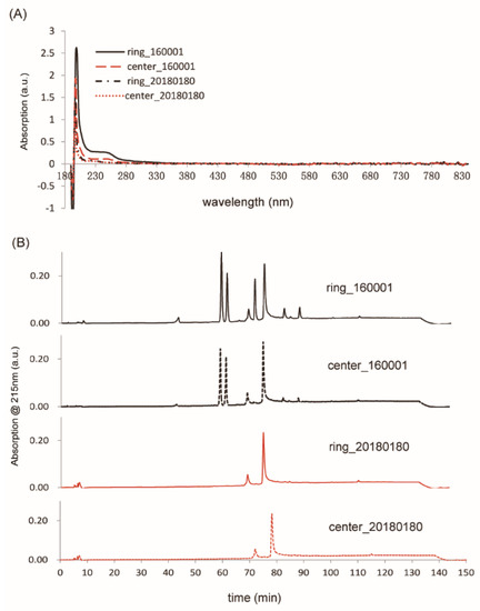 UV–Visible absorption spectroscopic and HPLC analysis of contaminants extracted from collection devices. (A) UV–Visible spectra of filter paper discs punched on the ink circle (ring) or inside the ink circle (center) from both contaminated (Lot160001) and new (Lot20180180) collection devices. All extractions have maximum absorption at around 200 nm. Extractions of contaminated collection devices have an additional absorption peak around 245 nm. No absorption was observed in the visible wavelength range for all samples. (B) HPLC chromatograms of above samples. Two prominent peaks were observed on the chromatograms of samples extracted from contaminated collection devices around 60min elution time, which were absent on samples from new collection devices.
