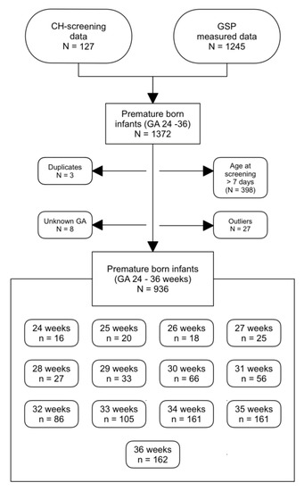 - Jacobsen, B.B.; Andersen, H.J.; Peitersen, B.; Dige-Petersen, H.; Hummer, L. Serum Levels of Thyrotropin, Thyroxine and Triiodothyronine in Fullterm, Small-for-gestational Age and Preterm Newborn Babies. Acta Paediatr. 1977, 66, 681–687. [Google Scholar] [CrossRef]