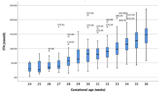 - Clark, S.J.; Deming, D.D.; Emery, J.R.; Adams, L.M.; Carlton, E.I.; Nelson, J.C. Reference Ranges for Thyroid Function Tests in Premature Infants Beyond the First Week of Life. J. Perinatol. 2001, 21, 531–536. [Google Scholar] [CrossRef][Green Version]
