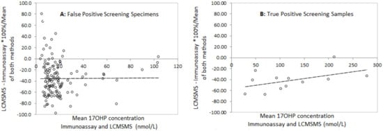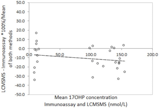 Salter et al. [9] and Janzen et al. [10] found poor correlation between LCMSMS and radioimmunoassay in a small number of CAH patient samples. When comparing the two techniques, Boelen et al. reported that LCMSMS measurements in neonatal samples were up to 75% lower than immunoassay [15], while Dhillon et al. showed that the difference between LCMSMS and immunoassay was much wider in very low birth weight babies [16]. Our data confirms their reports that LCMSMS 17OHP is significantly lower and the differences are highly variable, particularly in low birth weight babies.
