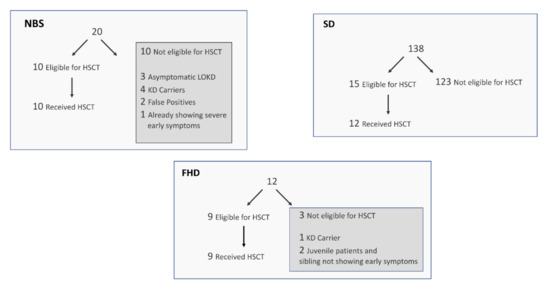 Figure 1 summarizes the KD patients in terms of eligibility to receive a transplant and whether families opted for this treatment. For the NBS group, 10 of 20 were eligible for transplant, and all 10 elected to have the transplant. Among the 10 not eligible for transplant, five newborns were identified as KD carriers, three were identified as asymptomatic newborns with a risk of developing later-onset KD, one was already symptomatic with early infantile KD, and two were identified as false positives for NBS of KD. Among the FHD group, three of 12 were not yet eligible for a transplant. Of the three ineligible patients, one is a carrier of the disease and is not at risk for developing symptoms, and the other two have juvenile onset KD, so a transplant would not be accessible until just prior to the predicted onset of disease. Nine of 12 FHD families were eligible for a transplant, and all of these families elected to have the transplant. Among the SD group, 15 of 138 were eligible for a transplant. Three of these 15 refused treatment, because their child was already symptomatic and transplant would likely not reverse the demyelination that already occurred.