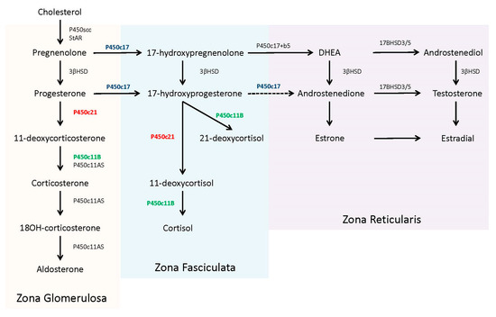 Unesterified cholesterol, derived from circulating low-density lipoprotein, is the precursor for adrenal steroidogenesis. The steroidogenic acute regulatory protein (StAR) assists in the transport of cholesterol from the cytosol to the inner mitochondria membrane to be converted into pregnenolone using the P450 side-chain cleavage (P450scc) enzyme. Pregnenolone then enters the smooth endoplasmic reticulum, where it is further converted to specific steroids, depending upon the compliment of other required enzymes [4]. The zona fasciculate of the adult adrenal contains abundant 17α-hydroxylase activity (P450c17), along with 3β-hydroxysteroid dehydrogenase (3βHSD), 21-hydroxylase (P450c21), and 11β-hydroxylase (P450c11B), which are all necessary for the production of cortisol from pregnenolone. The zona glomerulosa lacks the 17α-hydroxylase enzyme, committing pregnenolone to the exclusive production of aldosterone. In contrast, the zona reticularis in the adult adrenal contains 17α-hydroxylase and abundant cytochrome b5, which supports 17,20 lyase activity by the P450c17 protein. Of note, human 17,20 lyase activity favors production of dehydroepiandrosterone (DHEA), not androstenedione, which is rapidly used by other tissues for testosterone production [4,10]. The complete steroidogenic pathway with partitioning for each zone is shown in Figure 1.