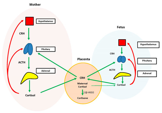 Maternal, placental, fetal unit. A representation of the hormone exchange between the maternal, fetal, and placental units. The maternal hypothalamic-pituitary-adrenal (HPA) axis stimulates cortisol production. Maternal cortisol is transferred to the placenta and converted into cortisone by 11β-HSD2, with only minimal exposure of the fetus to cortisol (dashed green line). Maternal cortisol also stimulates production of placental corticotropin-releasing hormone (CRH), which in turn activates synthesis and release of additional maternal adrenocorticotropic hormone (ACTH), creating a positive feedback loop (green arrows). Placental CRH also enters the fetal circulation and stimulates release of ACTH, which allows for production of fetal cortisol. Fetal cortisol stimulates additional placental CRH production creating a second positive feedback loop. Excess cortisol inhibits production of CRH and ACTH both within the maternal and fetal units (red arrows). Figure was modified from the Howland et al. (2017) reference [33].