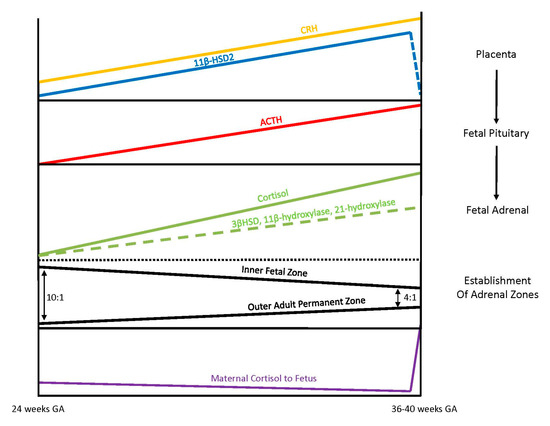 Dynamic changes of the fetal hypothalamic-pituitary-adrenal axis. During the third trimester, 24 to 36–40 weeks of gestation, the placenta increases production of corticotropin-releasing hormone (CRH). In response to placental CRH, production of adrenocorticotropic hormone (ACTH) by the fetal pituitary accelerates and stimulates the fetal adrenal to undergo steroidogenesis for cortisol production. Required enzymes for cortisol production within the adrenal, 3β- hydroxysteroid dehydrogenase (3βHSD), 21-hydroxylase (P450c21), 11β-hydroxylase, are activated. The establishment of the outer adult permanent zone of the adrenal also occurs during the third trimester. During the third trimester, activity of 11β-hydroxysteroid dehydrogenase 2 (11β-HSD2) within the placenta also increases and thereby exposure of the fetus to maternal cortisol remains low until the surge right before delivery. Figure was modified from the Howland et al. (2017) reference [33].