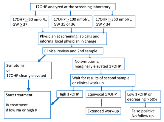 - White, P.C. Optimizing newborn screening for congenital adrenal hyperplasia. J. Pediatr. 2013, 163, 10–12. [Google Scholar] [CrossRef] [PubMed]