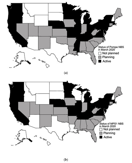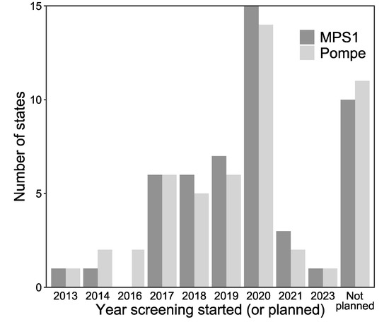 All 50 states responded to our survey. As of March 2020, there are currently 22 states screening for Pompe disease, as shown in Figure 1a. There are 20 states currently screening for MPSI (Figure 1b). In total, 20 states are screening for both LSDs on the RUSP currently. Ten states are screening for other LSDs, including Fabry disease (Illinois, Maryland, Missouri, New Jersey, Oregon, Pennsylvania, Tennessee), Gaucher disease (Illinois, Missouri, New Jersey, Oregon, Pennsylvania, Tennessee), Krabbe disease (Illinois, Kentucky, Missouri, New Jersey, New York, Ohio, Pennsylvania, Tennessee), mucopolysaccharidosis type II (Illinois, Missouri), and Niemann–Pick disease type A/B (Illinois, New Jersey, Pennsylvania).