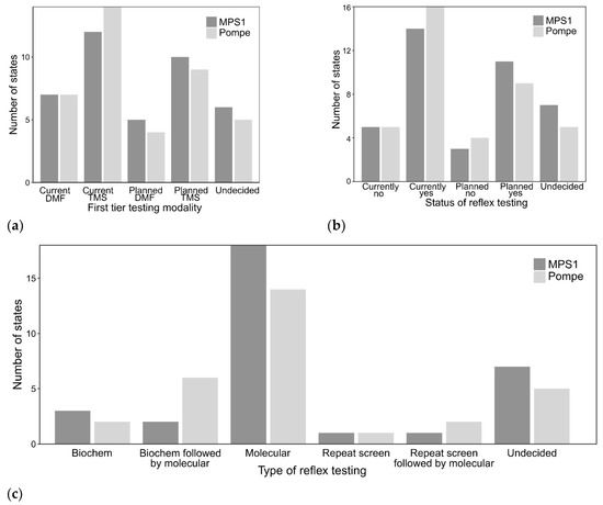 First-tier NBS and reflex testing modality for MPSI (dark gray) and Pompe disease (light gray). (a) First-tier testing modality divided between current screening vs. planned screening with either tandem mass spectrometry (TMS) and digital microfluidics (DMF); (b) Distribution whether states currently or plan to utilize reflex testing; (c) Modality of reflex testing (current and planned screening grouped together) based on additional biochemical testing (Biochem), additional biochemical testing followed by molecular testing (Biochem followed by molecular), molecular testing, repeat screening, repeat screening followed by molecular, and undecided.