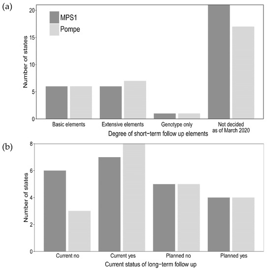 Current and planned efforts for short- and long-term follow-up for MPSI (dark gray) and Pompe disease (light gray). (a) Degree of short-term data elements collected (see methods section for explanation of basic and extensive elements); (b) Status of long-term follow-up for current and planned screening.