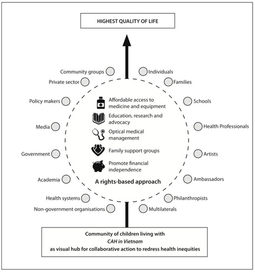 A published survey of 53 families of children living with CAH in Vietnam in 2005 [14] led to the development of CLAN’s rights-based, strategic framework for action (Figure 1) which seeks to focus multisectoral collaborative efforts on five pillars considered essential to achieving the highest quality of life possible for communities of children living with chronic health conditions: