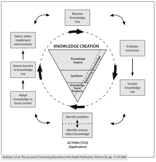 - Graham, I.D.; Logan, J.; Harrison, M.B.; Straus, S.E.; Tetroe, J.; Caswell, W.; Robinson, N. Lost in knowledge translation: Time for a map? J. Contin. Educ. Health Prof. 2006, 26, 13–24. [Google Scholar] [CrossRef]