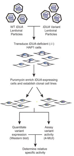 While this platform offers an accurate estimation of relative specific activity, it is limited with regard to speed. This is mainly due to the slow production of lentiviral particles and the relatively inefficient transduction of the HAP1 cells. To accelerate variant classification in the future, we are currently exploring the efficiency of transient transfection to deliver variant-bearing DNAs into an IDUA-deficient HEK293 cell line (followed by selection for stable transfectants). This approach has the advantage of lower cost and faster turnaround due to the high transfection efficiency of HEK293 cells. As an added level of assessment, we believe the analysis of GAG storage using assays that monitor the abundance of fragments with non-reducing ends in these clonal cell lines would allow us to correlate α-iduronidase specific activity with functional clearance of GAG storage. One significant caveat, however, is the overexpression of IDUA in these clonal lines. While this does not appear to influence our specific activity measurements, high-level expression of α-iduronidase with reduced activity might still maintain enough intralysosomal hydrolytic capacity to avoid detectable GAG storage.